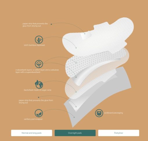 Gli assorbenti sono ultra sottili e rivistiti con un film di tessuto non tessuto in bambù. Risultano essere molto assorbenti e garantiscono protezione per tutto il giorno. La loro struttura con grandi ali è perfetta per aderire alla biancheria intima. Grazie al nucleo assorbente rivestito in bambù e realizzato in cotone, viscosa e cellulosa, il liquido penetra rapidamente e viene contenuto all’interno dell’assorbente in modo uniforme e evitando fuoriuscite e perdite.